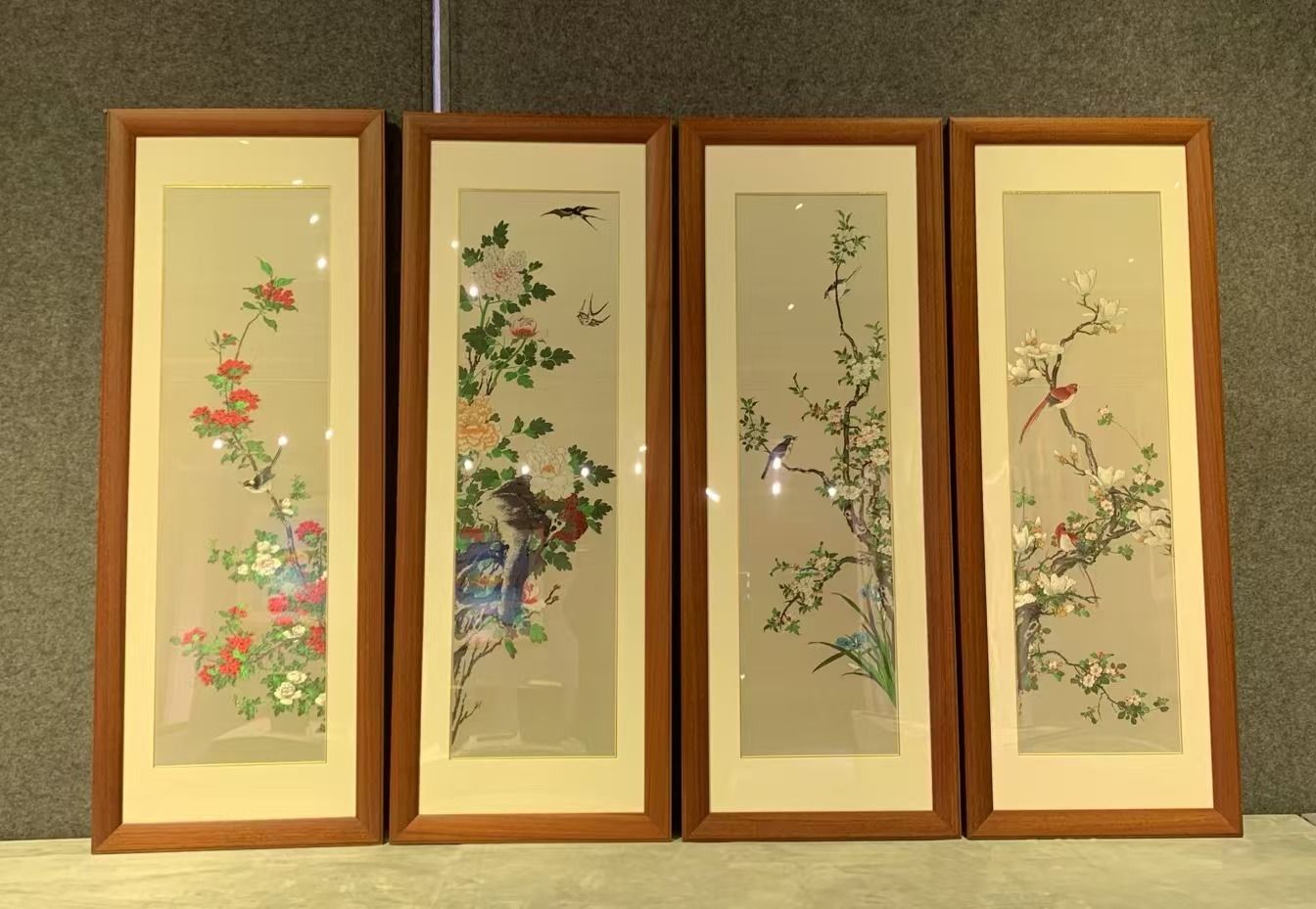 《花鸟四条屏》以清代宫廷画家陈枚《四季花鸟图屏》为蓝本,借助蜀锦“以梭代笔”的独特工艺,将原画中的水墨意境、四时景致和哲学内涵转化为织物的肌理与光泽。丝线通过层次叠加表现出花鸟的立体感和触觉温度,实现了从纸本到织物的艺术媒介转换,使蜀锦从传统工艺标本转变为具有当代叙事能力的艺术载体。该作品不仅体现了蜀锦织造技艺的高超水平,更是一次深度的文化对话与传统技艺活化实践。它连接了清代画家陈枚的艺术灵魂与现代工匠的技艺精神,彰显出中国文化基因的延续性与创新性,是对“让文物活起来”理念的有力回应。
