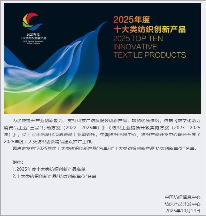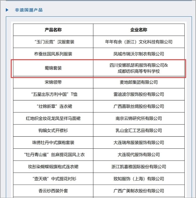 近日,工业和信息化部消费品工业司发布“2025年度十大类纺织创新精品”名单。我校与四川安娜凯瑟斯服饰有限公司联合研发的“蜀锦套装”成功入选,成为本年度名单中唯一有高校参加的获奖产品,充分体现了我校在纺织非遗传承与创新领域的领先实力与示范作用。