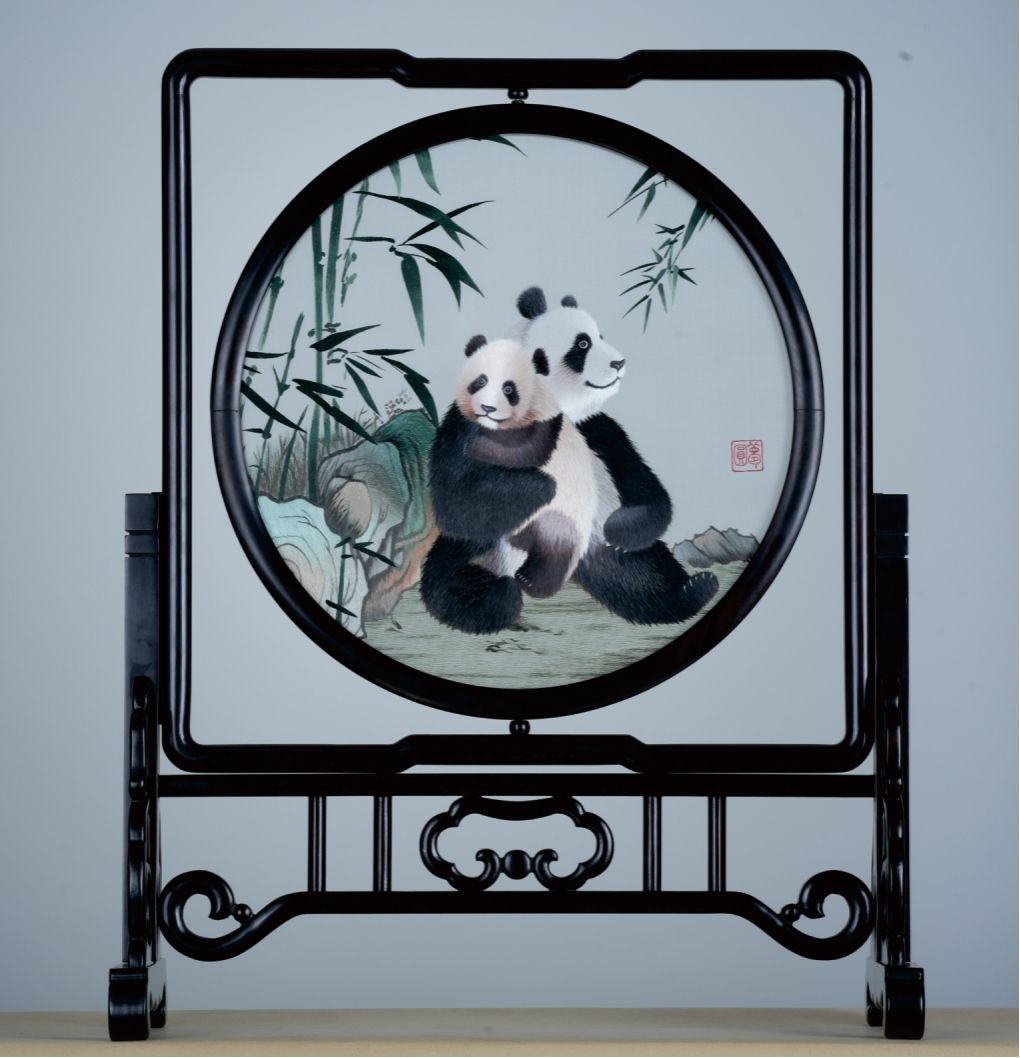 《锦丝连梦・中法情圆》以中法友谊结晶——大熊猫“圆梦”为核心题材,将“中国名片”熊猫与东方瑰宝蜀绣完美融合。作品由织绣技艺非遗数字化保护与传承四川省文化和旅游厅重点实验室牵头与蜀绣中心、创艺学院等相关教师共同创作,由国家级技能大师工作室负责人邬学强耗时三月匠心绣制,深谙蜀绣双面绣“双面同辉,虚实相生”的至高技艺,以丝毛、滚、切等六法精髓,精准复刻熊猫灵动神韵,辅以国画意境的翠竹山石,达成“丝赋形神,绣寄丹青”的艺术境界,成为非遗赋能文明对话的生动实践。